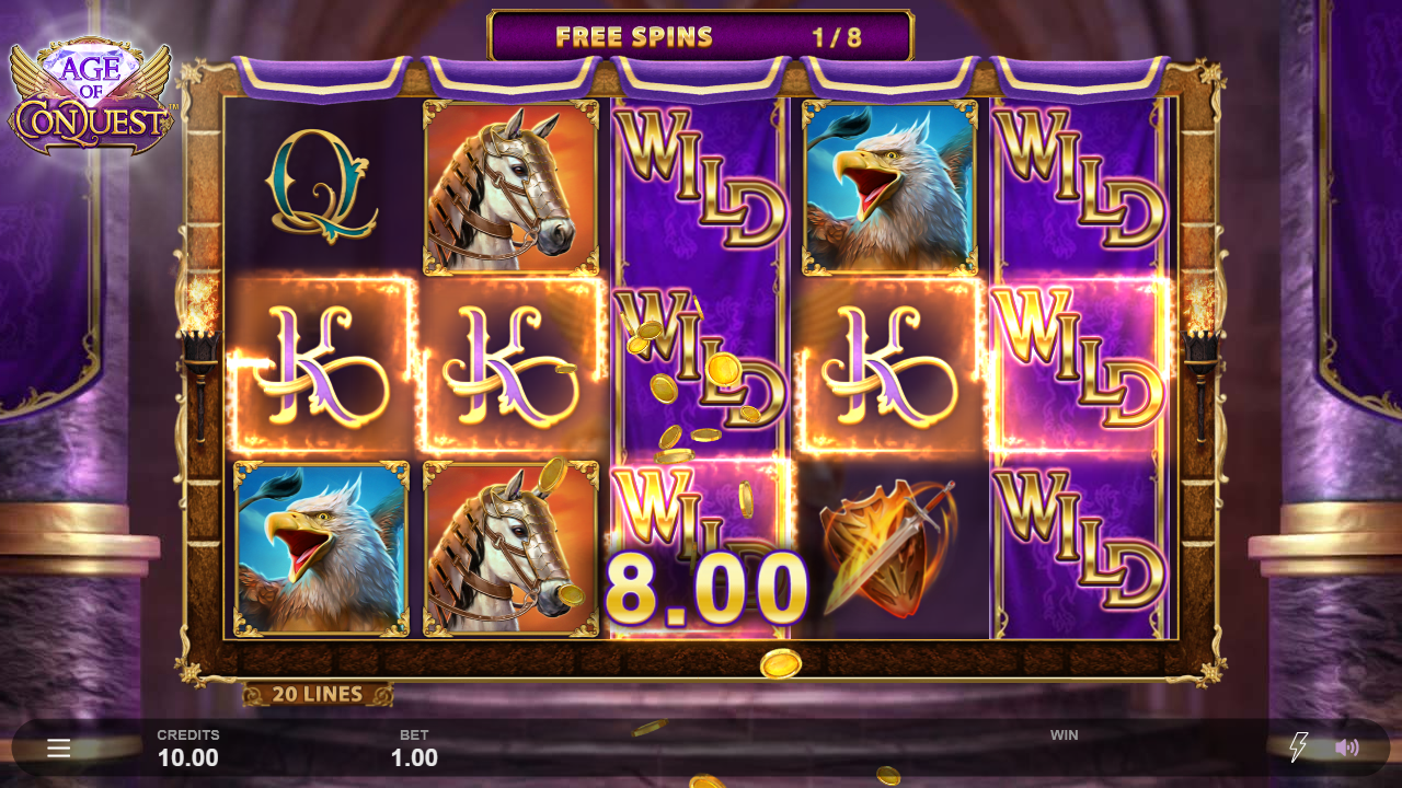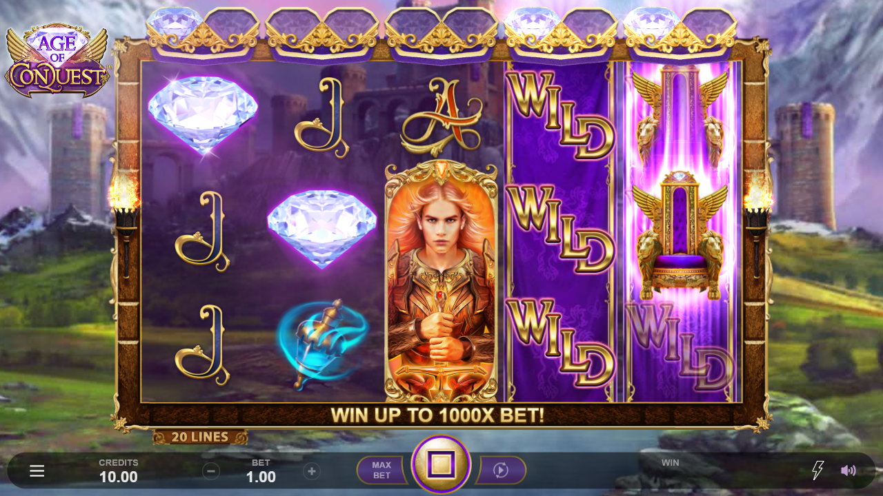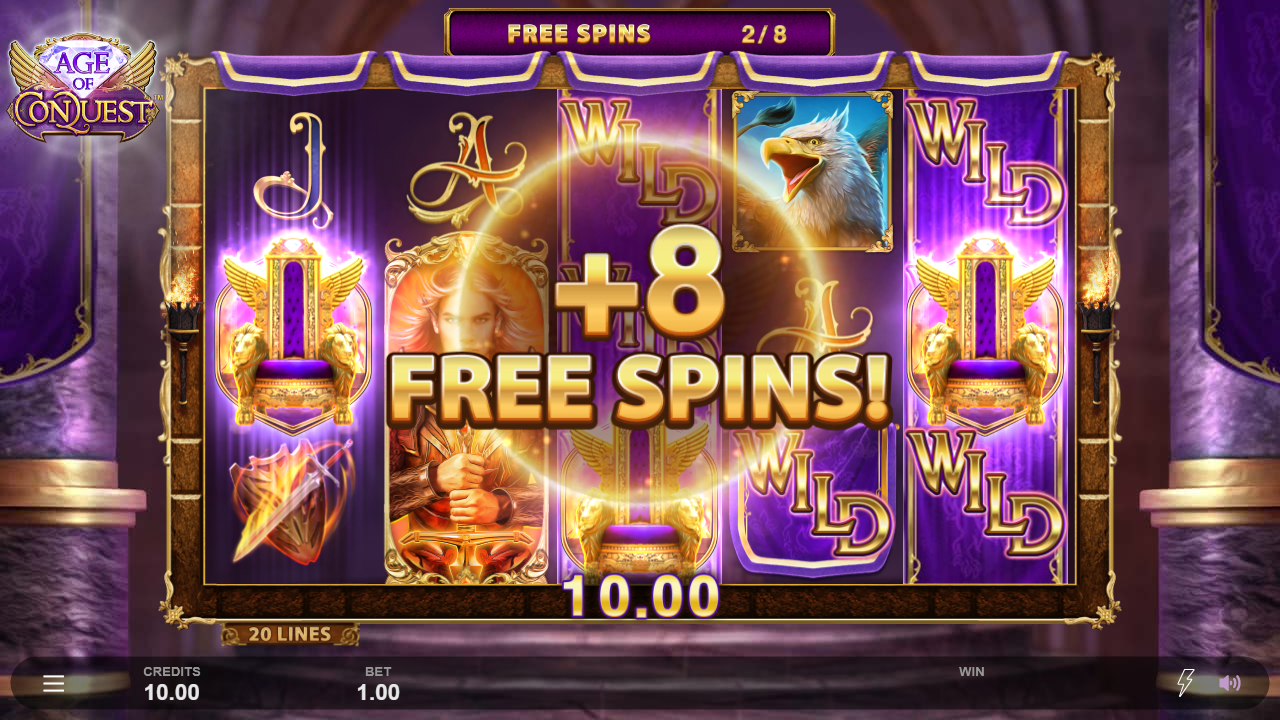 Reach the mysterious throne room and the spoils of the kingdom could be yours! Choose your own path to riches with 1, 2 or 3 random Wild Reels and 25, 8 or 2 free spins. Conquer a full retrigger and you could win up to 10,000 times your bet!