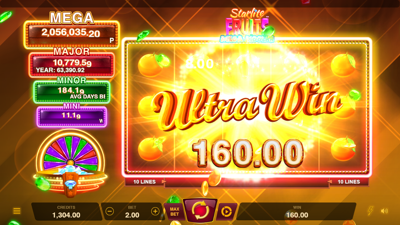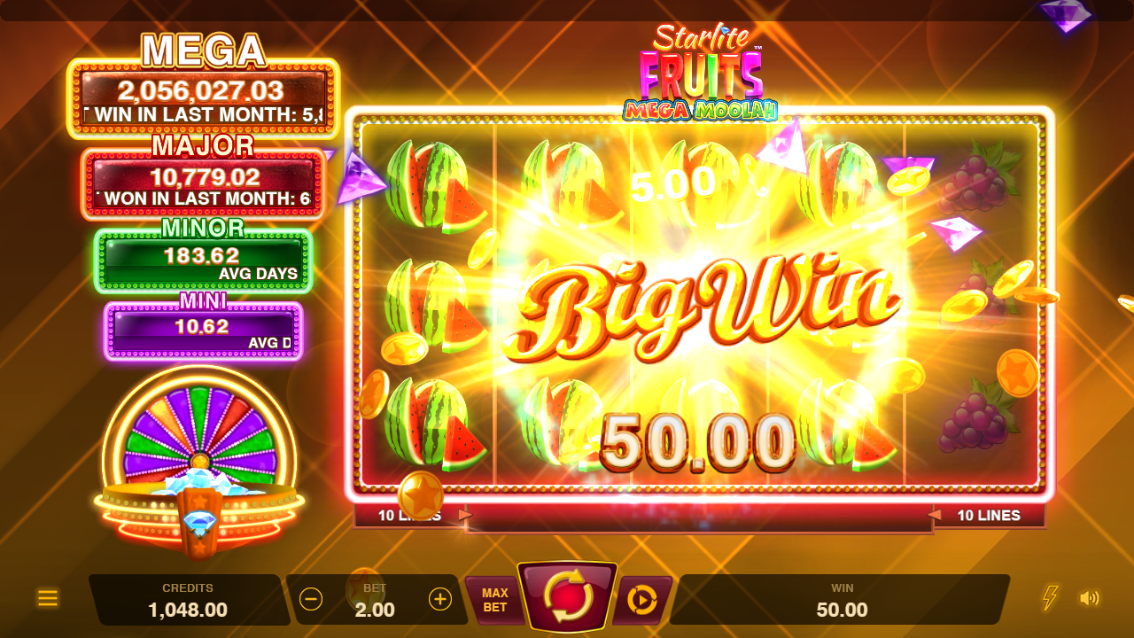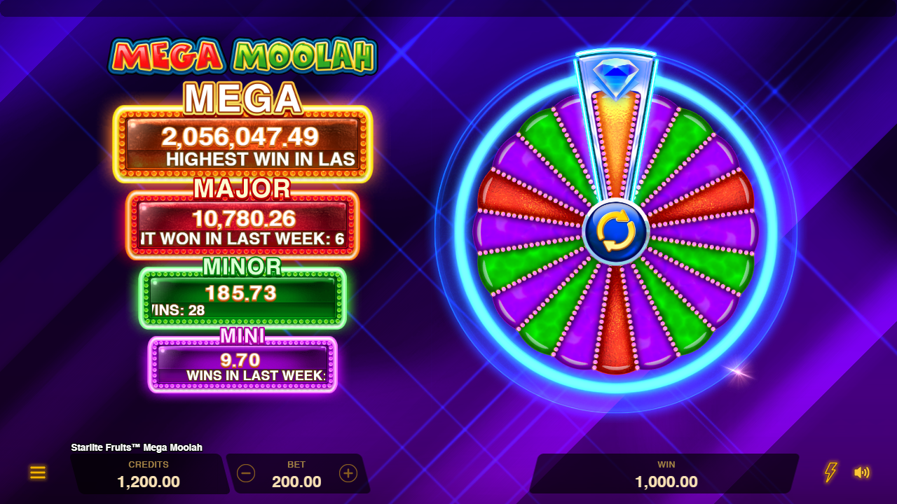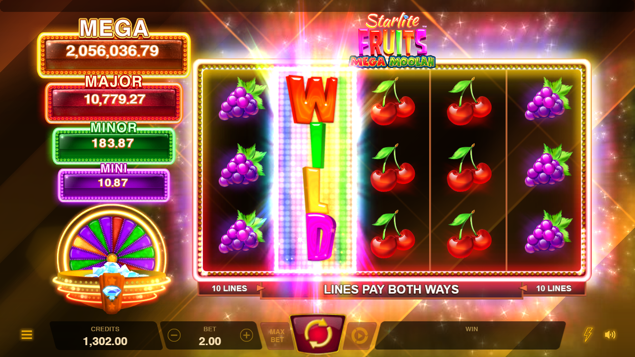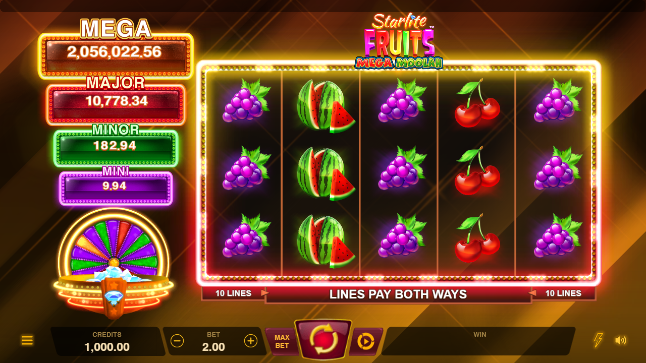 Experience the luscious Star Fruit Wilds that expand to a full wild reel, lock, and award a Respin! Land shimmering diamonds for a chance to trigger the Jackpot Wheel Bonus where four enticing static Jackpots await. Spin the wheel for one of 4 prizes including the top 2500 times bet Mega Jackpot!